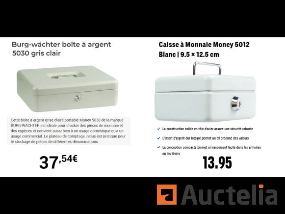 Spaarpot Merk: BURGWACHTER Model: 5030 Afmetingen: 30 x 24 x 9 cm (B x D x H) Conditie: Nieuw Munt Kassa Merk: BURGWACHTER Model: 5012 Afmeting: 9,5 × 12,5 cm Conditie: Nieuw Verzending: Tarief A