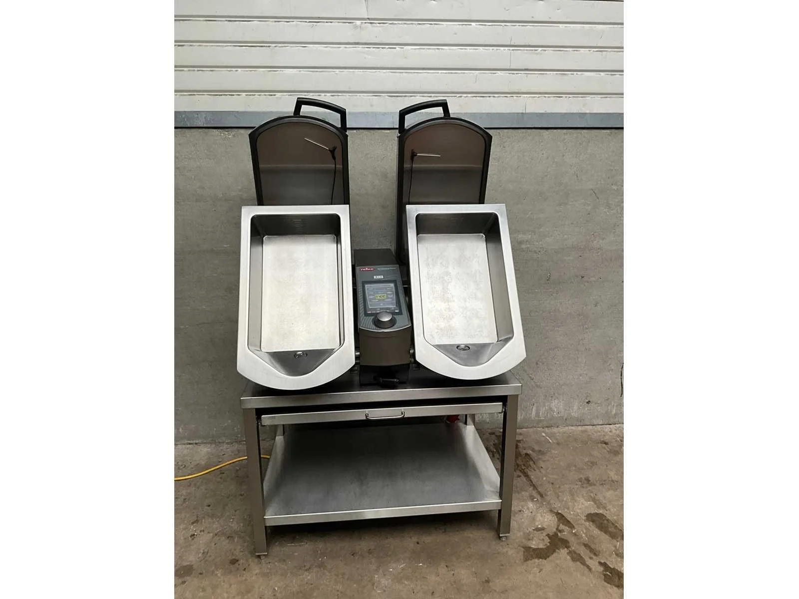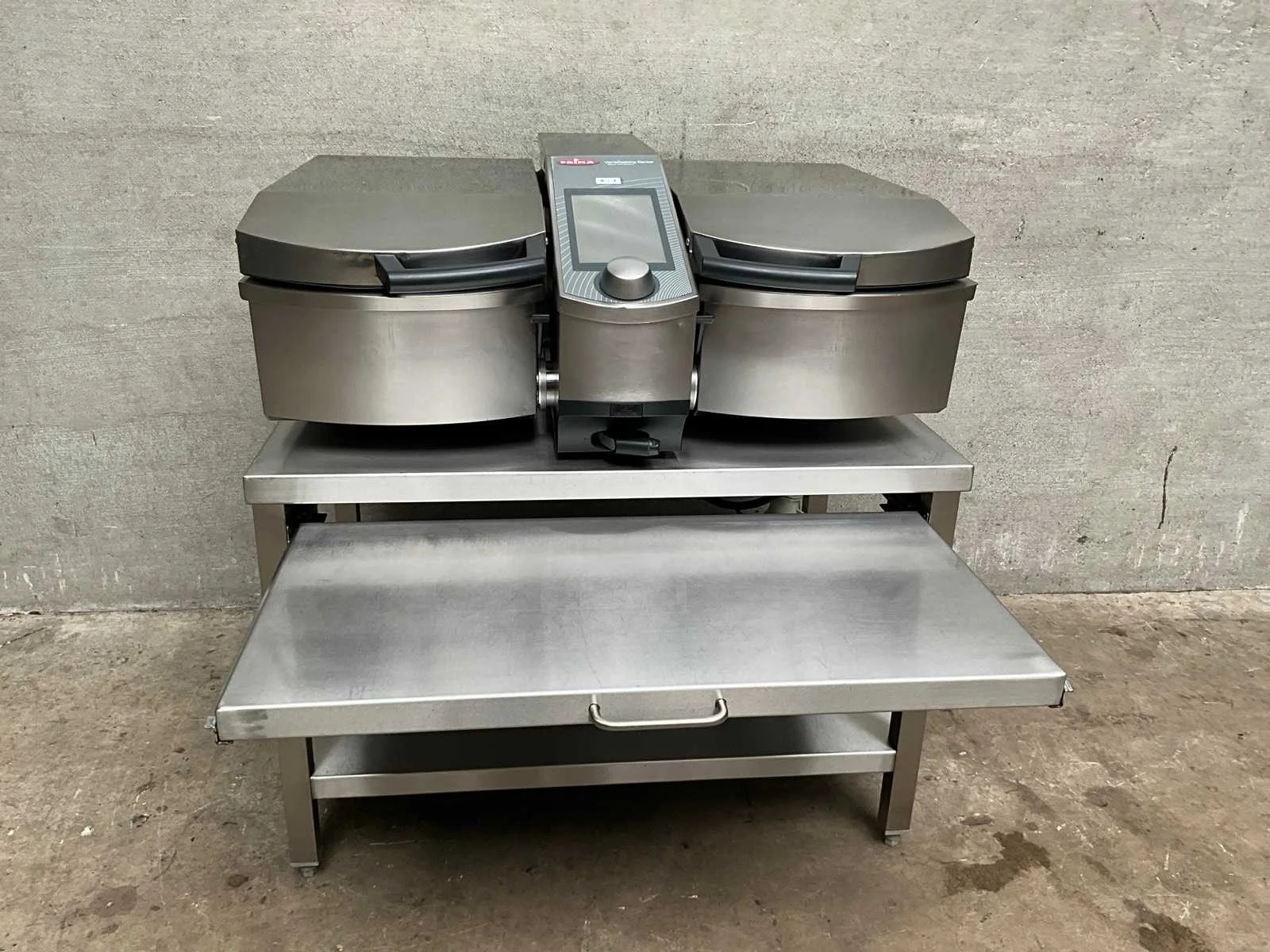 Vario cooking Center, 2 kantelbare braadsledes met een inhoud van 14 liter, op onderstel met uitschuifbaar plateau, geschikt om te koken, bakken, braden, stoven en frituren Merk: Frima Type: VCC 112T Elektrisch verwarmd: true Aansluiting: 400V Totale afmeting L: 960mm Totale afmeting Breedte: 800mm Totale afmeting Hoogte: 10mm