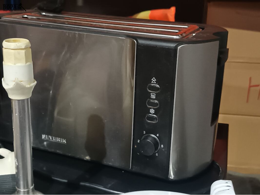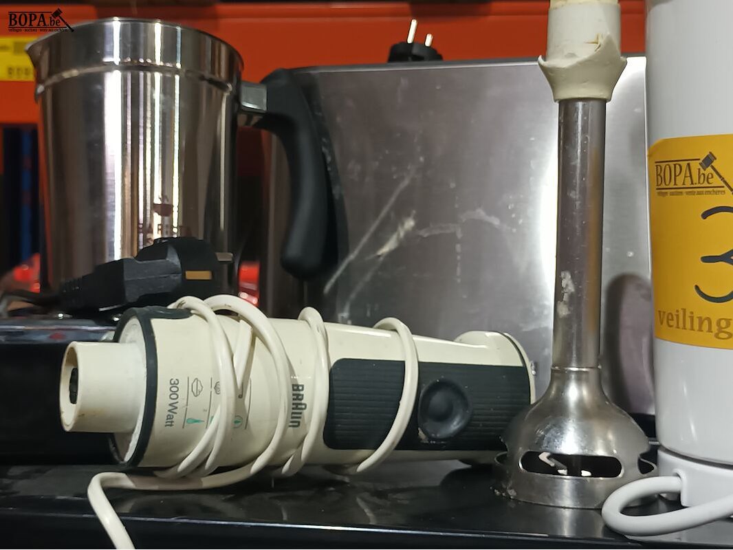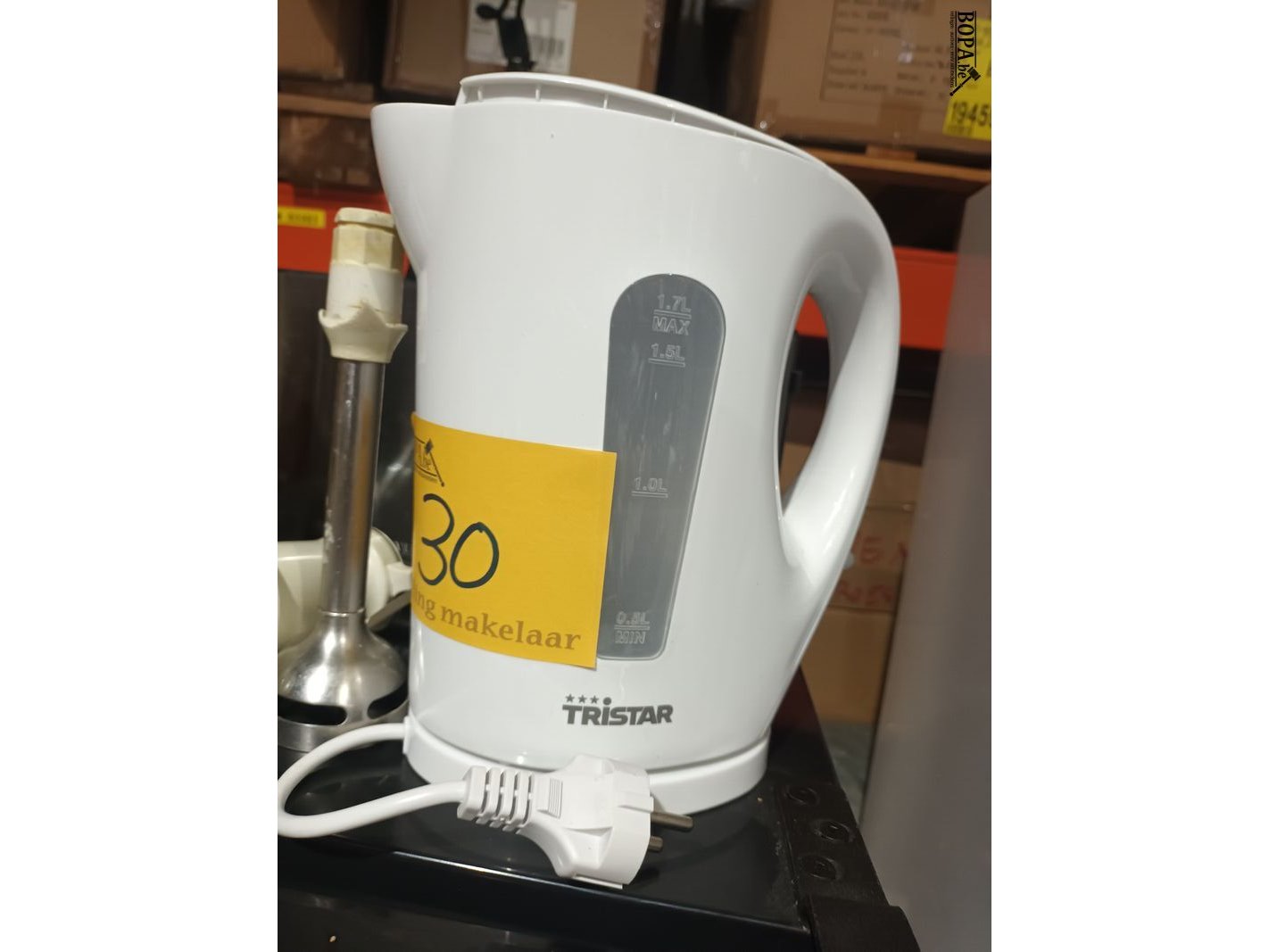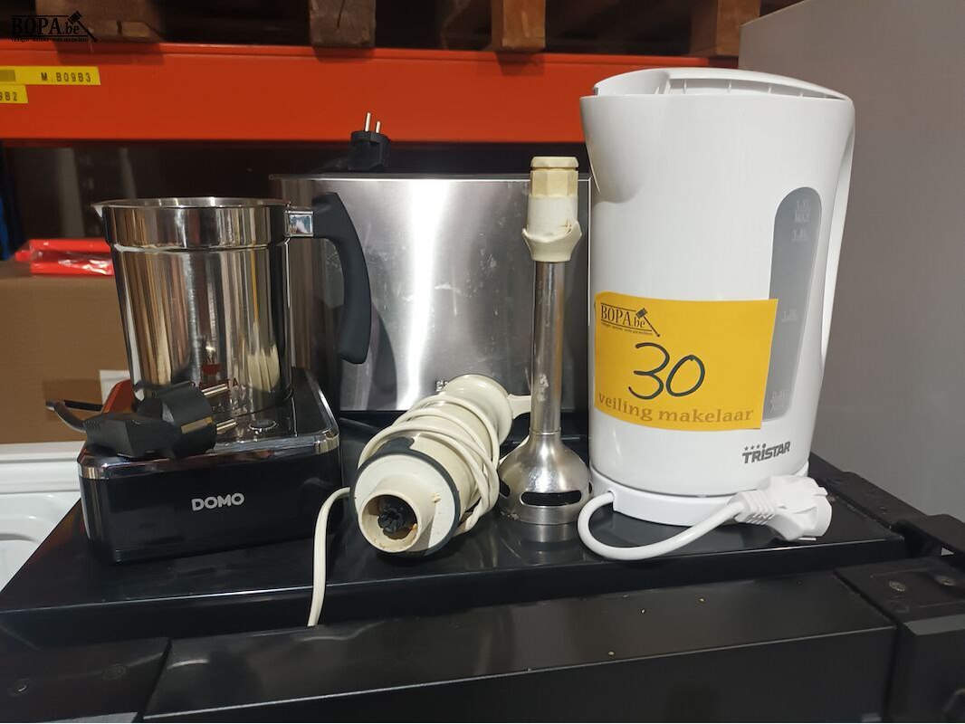 Keukentoestellen. 4 stuks. Tristar waterkoker, melkopschuimer Domo, staafmixer Braun en broodrooster Severin.