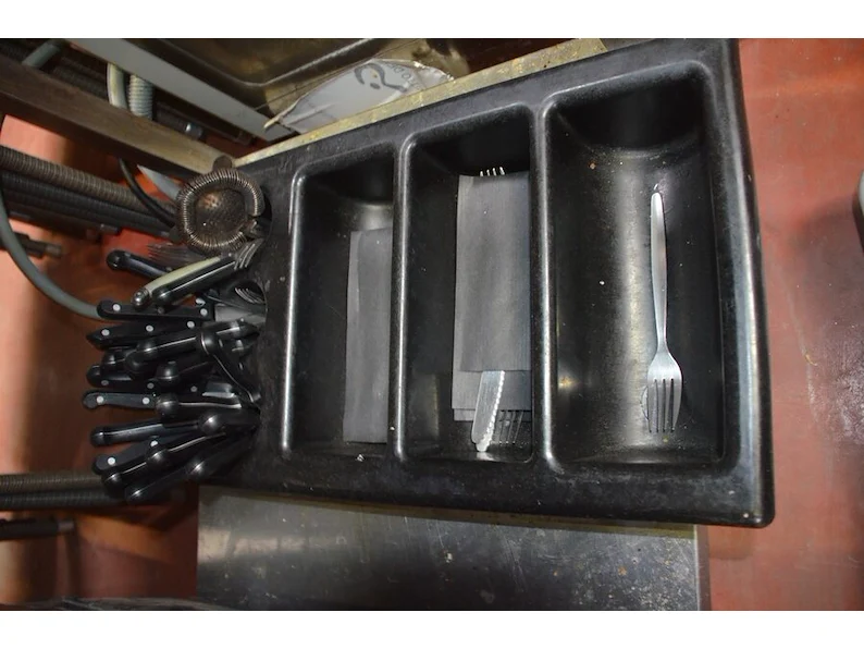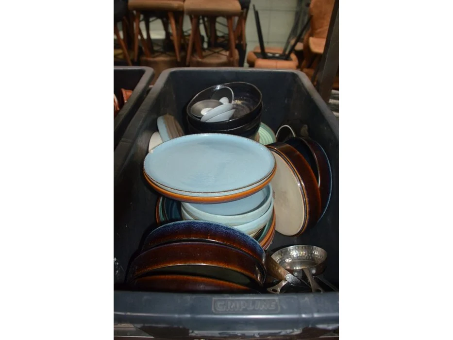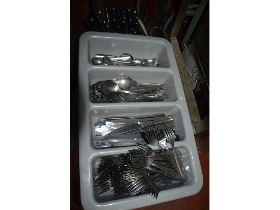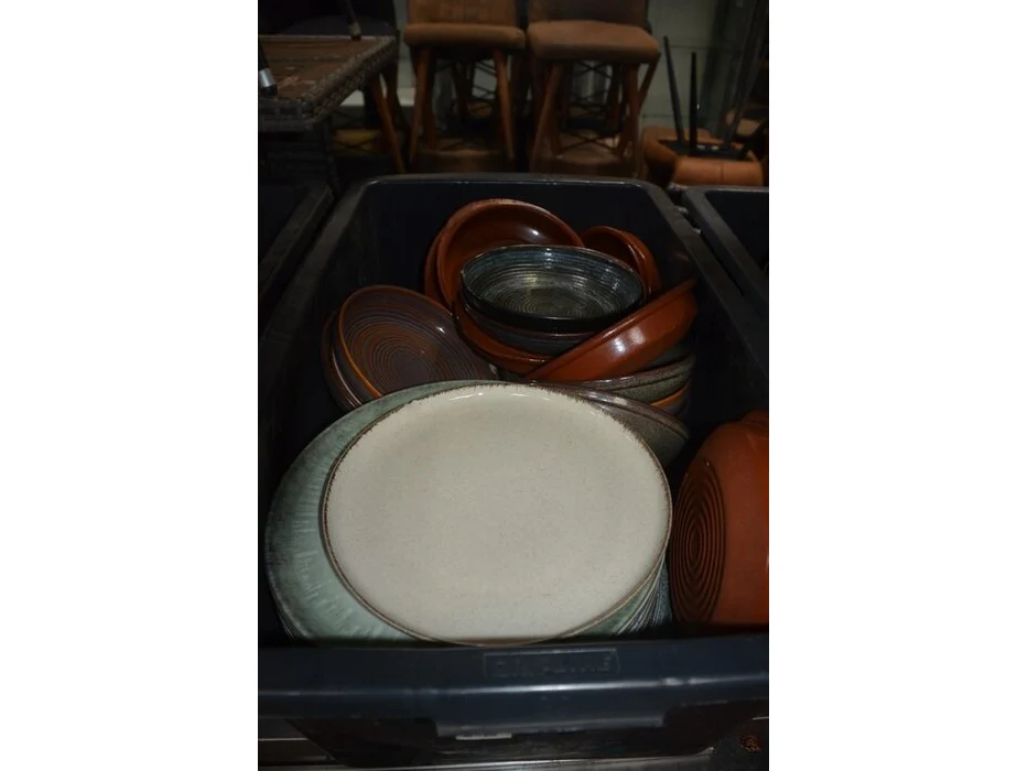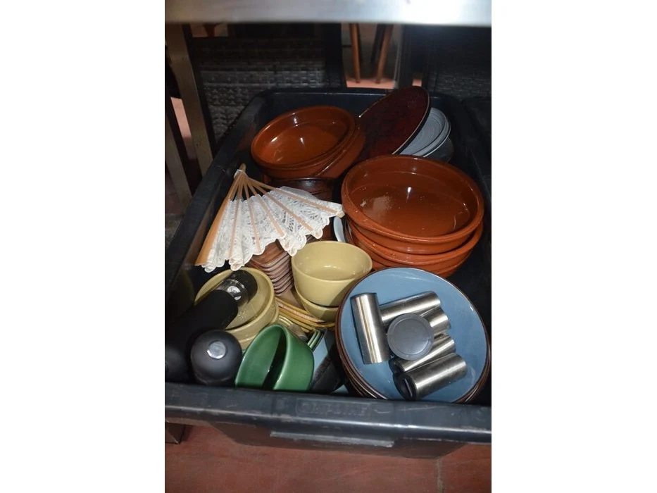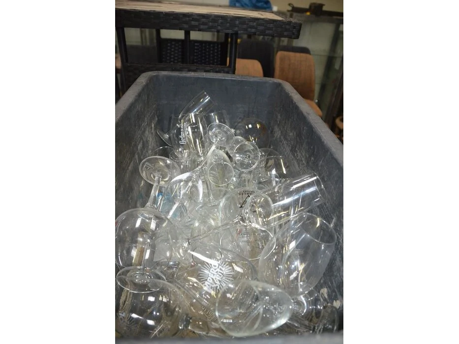 2 pvc bestekbakken met bestek, partij wijn- , bier- en frisdrankglazen, partij porseleinen borden en kommen (zonder bakken), pvc bestekbak met bestek (11,14,17,18)