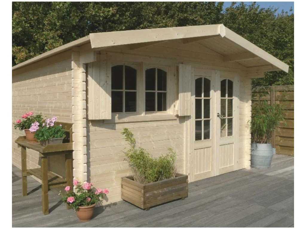 Het tuinhuisje Tignes is een traditionele blokhut uit gecertificeerd noord europees vurenhout,de praktische dubbele deur vergemakkelijkt de toegang en is ideaal om al uw tuingereedschap in te zetten,de versterkte dikte van de muren zorgt voor een betere isolatie,afmetingen: 4180 x 3880 x2526 mm,fundament:4180 x 3880 mm,oppervlakte:16.22m2,binnenoppervlakte:14.25m2,wanddikte:40mm,type dak:zadeldak met zwarte roofing,materiaal: onbehandeld te behandelen 42.10m2, gratis levering aan huis een tiental dagen voor de levering wordt u geinformeerd over de leverdatum.