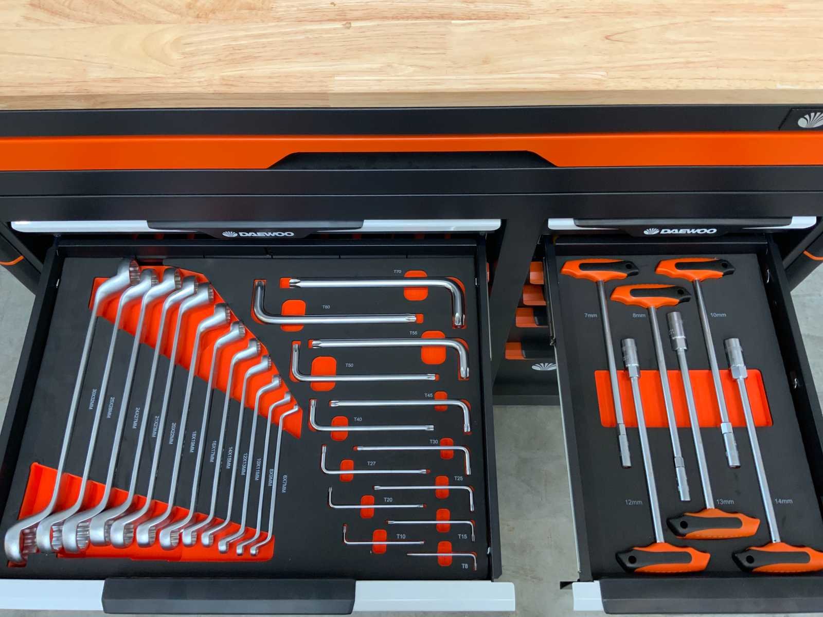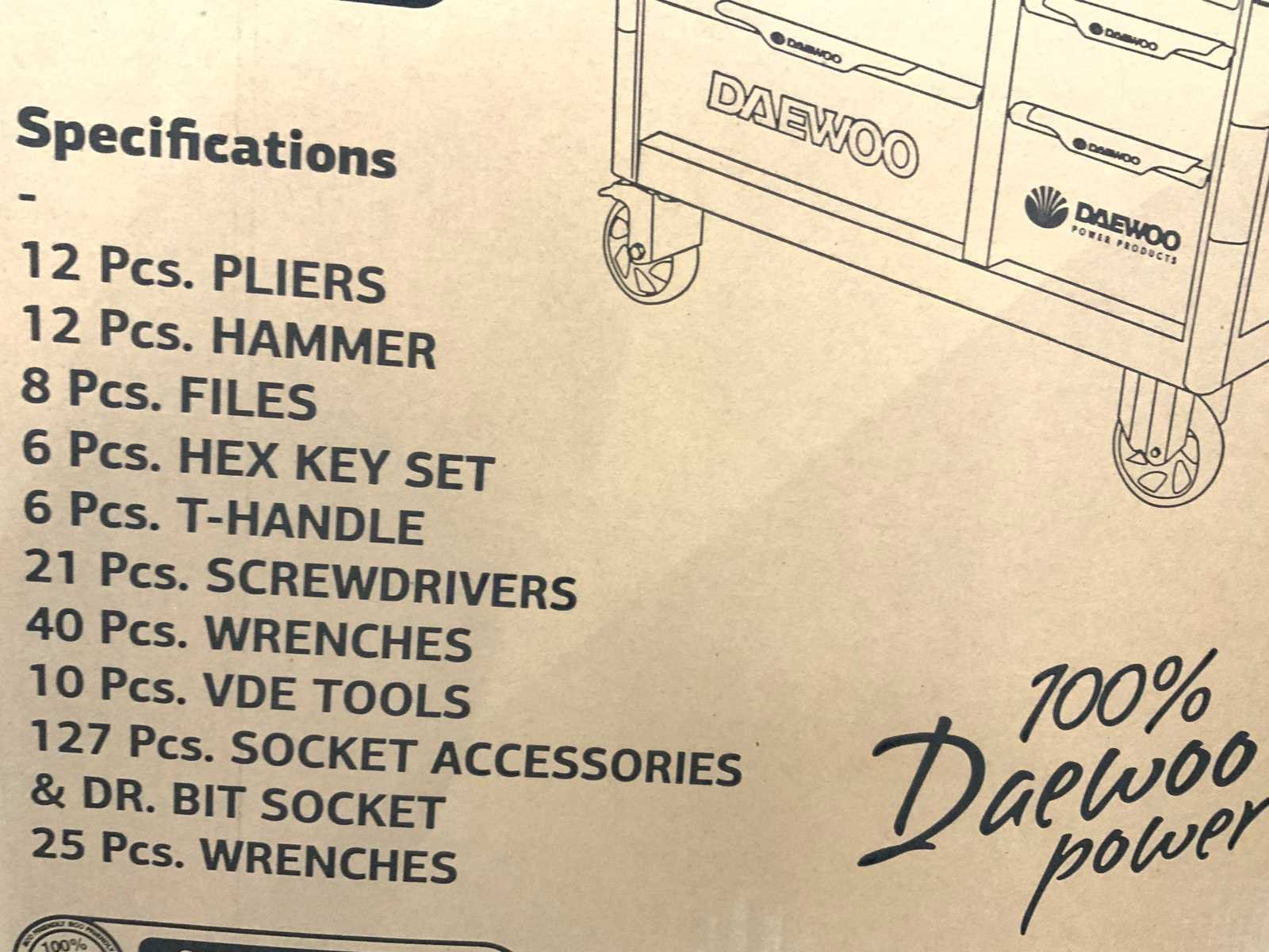 267 delig; 13 lades waarvan 11 lades gevuld; 12 tangen; 12 hamers; 8 Files ; 6 zeshoek sleutels; 6 T-Handle ; 21 schroevendraaiers; 40 steeksleutels; 10 imbus sleutels; 127 doppen en bitjes; 25 sleutels ; houten werkblad; verrijdbaar; remmen; 2 delen afsluitbaar; 5595 Nee Merk: Daewoo Model: DAMWS267 Type: 267 delig Lengte: 106cm Breedte: 57cm Hoogte: 110cm