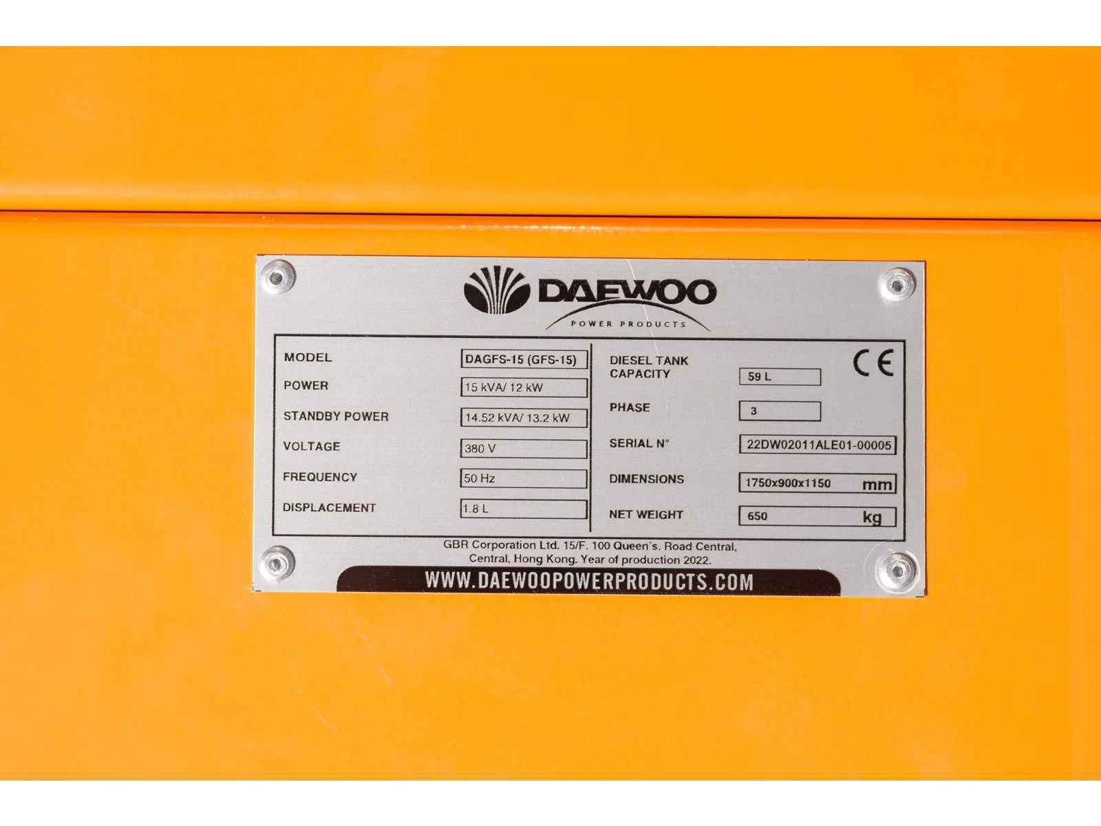 Frequency 50Hz;standby power 14.52Kva/13.2Kw;59 liter tank; 3fase; 4125 Nee Merk: daewoo Type: dagfs-15 Bouwjaar: 2022 Capaciteit.: 15kVA Aansluiting: 380V Motor merk: Ricardo ZH2105D Motorcapaciteit: 12kW Generator merk: ac generator Generator type: vg-164g Generator capaciteit: 33A Afgelezen urenstand: 0 Handboek aanwezig: true Machinegewicht: 650kg Totale afmeting L: 1750mm Totale afmeting Breedte: 900mm Totale afmeting Hoogte: 1150mm
