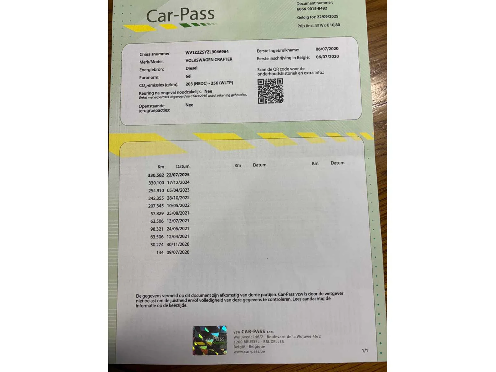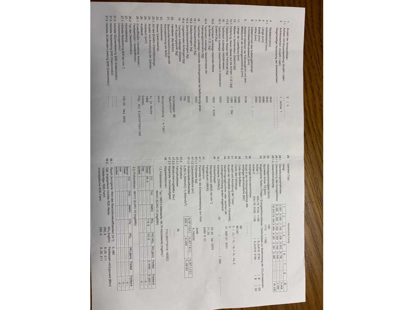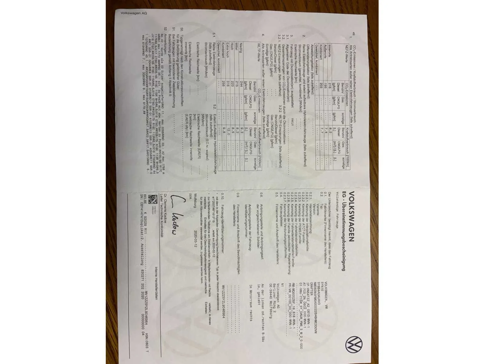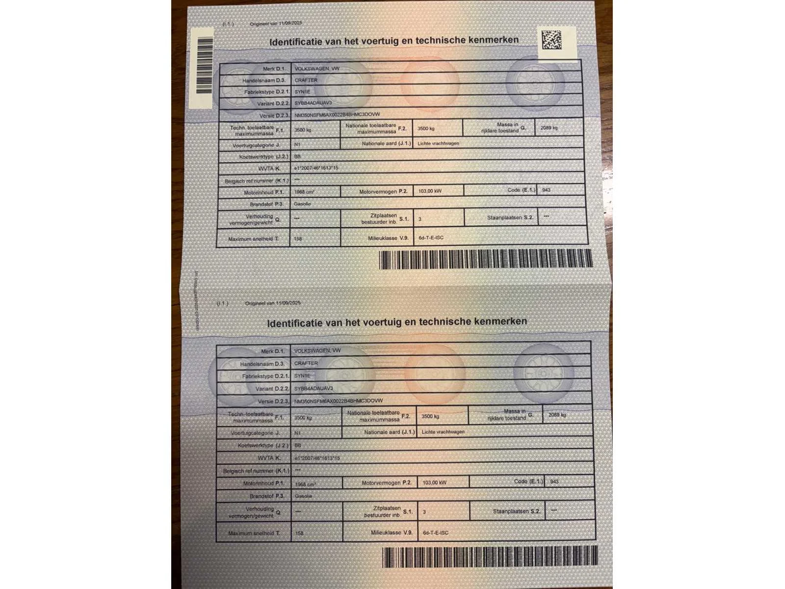 No Merk: Volkswagen Type: SYNIE Model: Crafter Bouwjaar: 2020 Chassisnummer: WV1ZZZSYZL9046964(01) Afgelezen kilometerstand: 330805km Cilinderinhoud: 1968cc Vermogen (kW): 103kW Brandstof: diesel Datum eerste toelating: 06/07/2020 Transmissie: handgeschakeld Aantal zitplaatsen: 3 Kleur: wit Nationaliteit documenten: Belgisch Carrosserie: Lichte vrachtwagen CO2-uitstoot NEDC: 203 Kentekenpapieren compleet?: true Boorddocumenten aanwezig?: true