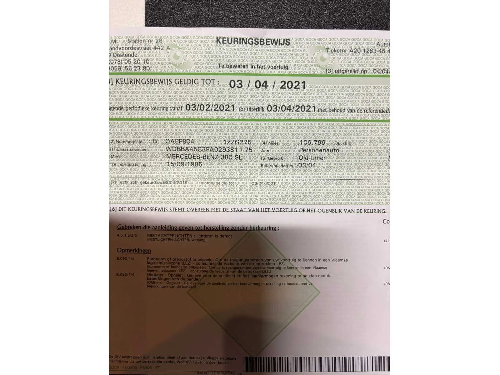 No Merk: Mercedes-Benz Bouwjaar: 1985 Chassisnummer: WDBBA45C3FA029381(01) Afgelezen mijlenstand: 107387mi Model: 380 SL Brandstof: Benzine Datum eerste toelating: 15/09/1985 Boorddocumenten aanwezig?: true Nationaliteit documenten: Belgisch Carrosserie: Cabrio Transmissie: automaat Aantal deuren: 3 Aantal zitplaatsen: 2 Kleur: Onbekend Inschrijvingsbewijs - deel 1 : Aanwezig