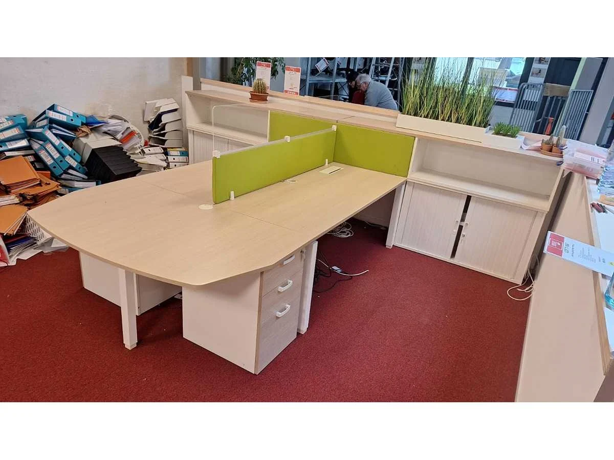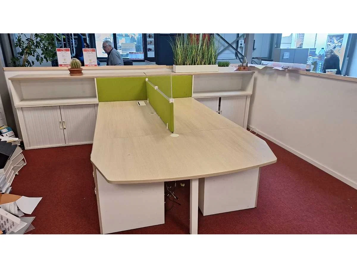 Onderstel in metaal kleur Wit, bladen in melamine kleur lichte eik voorzien van kabebldoorvoeren, vaste ladenblokken onder de opstelling voorzien van dossierlade + 2 gewone lades, bureauretour met ladenkastje aan beide zijdes, akoestische wandjes met bekleding in stof kleur groen, lichte gebruikssporen aanwezig No Merk: Meubelline Kleur: Lichte Eik - wit Gewicht: 150kg Lengte: 402cm Breedte: 320cm Hoogte: 73cm Materiaal: metaal, hout, melamine, kunststof