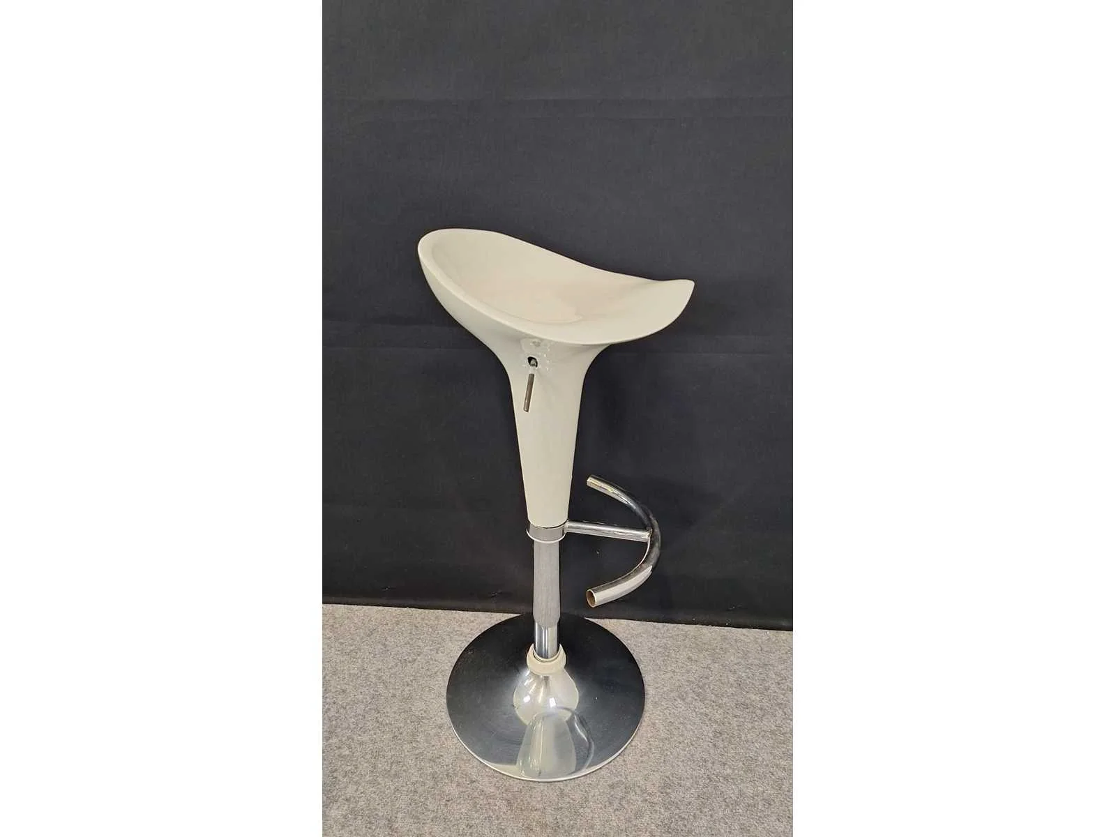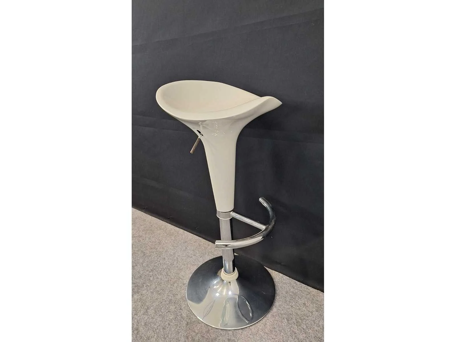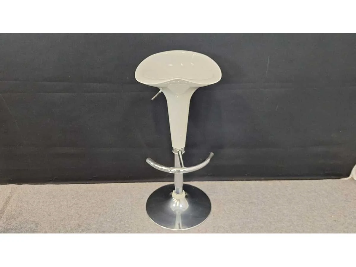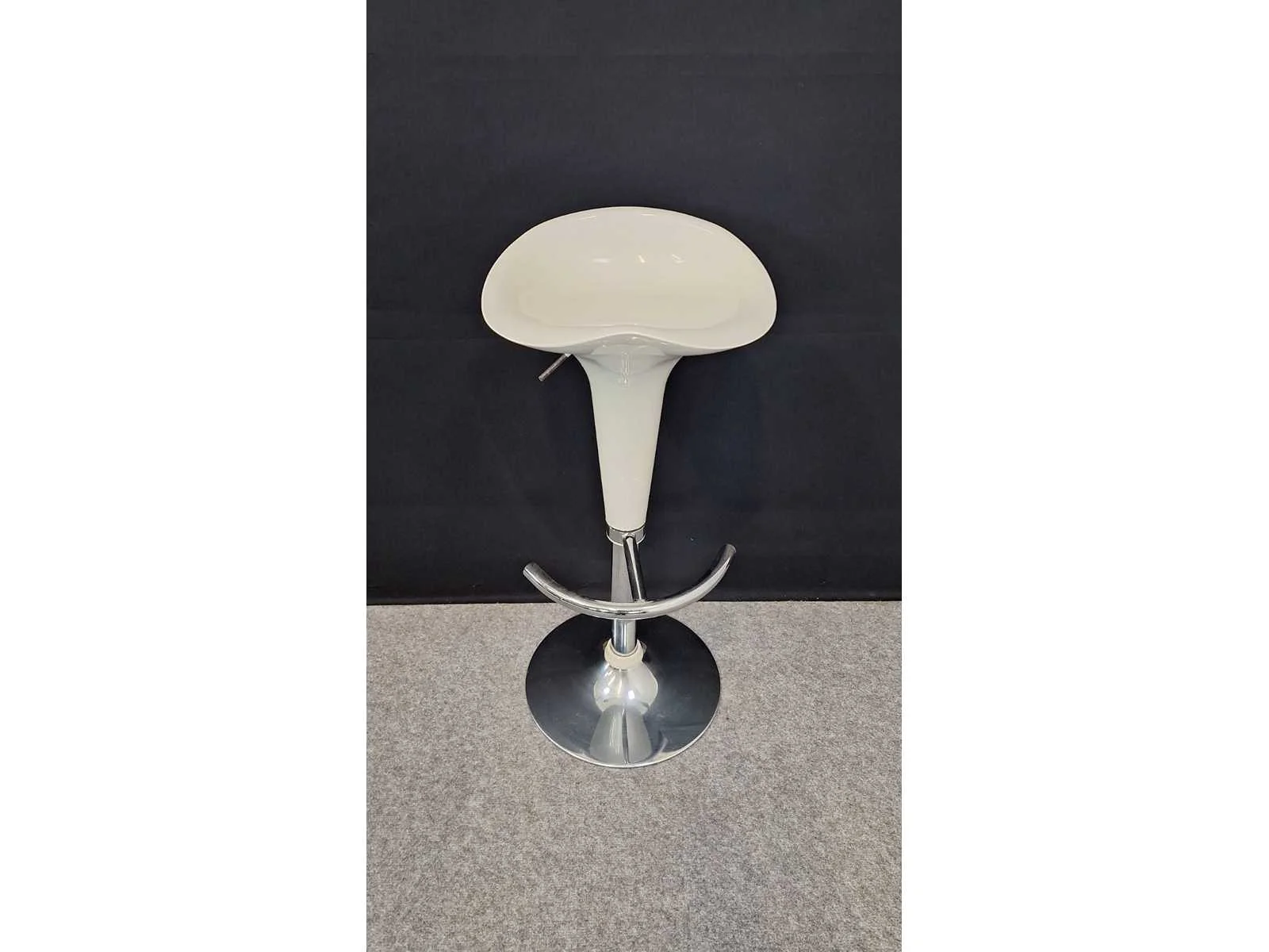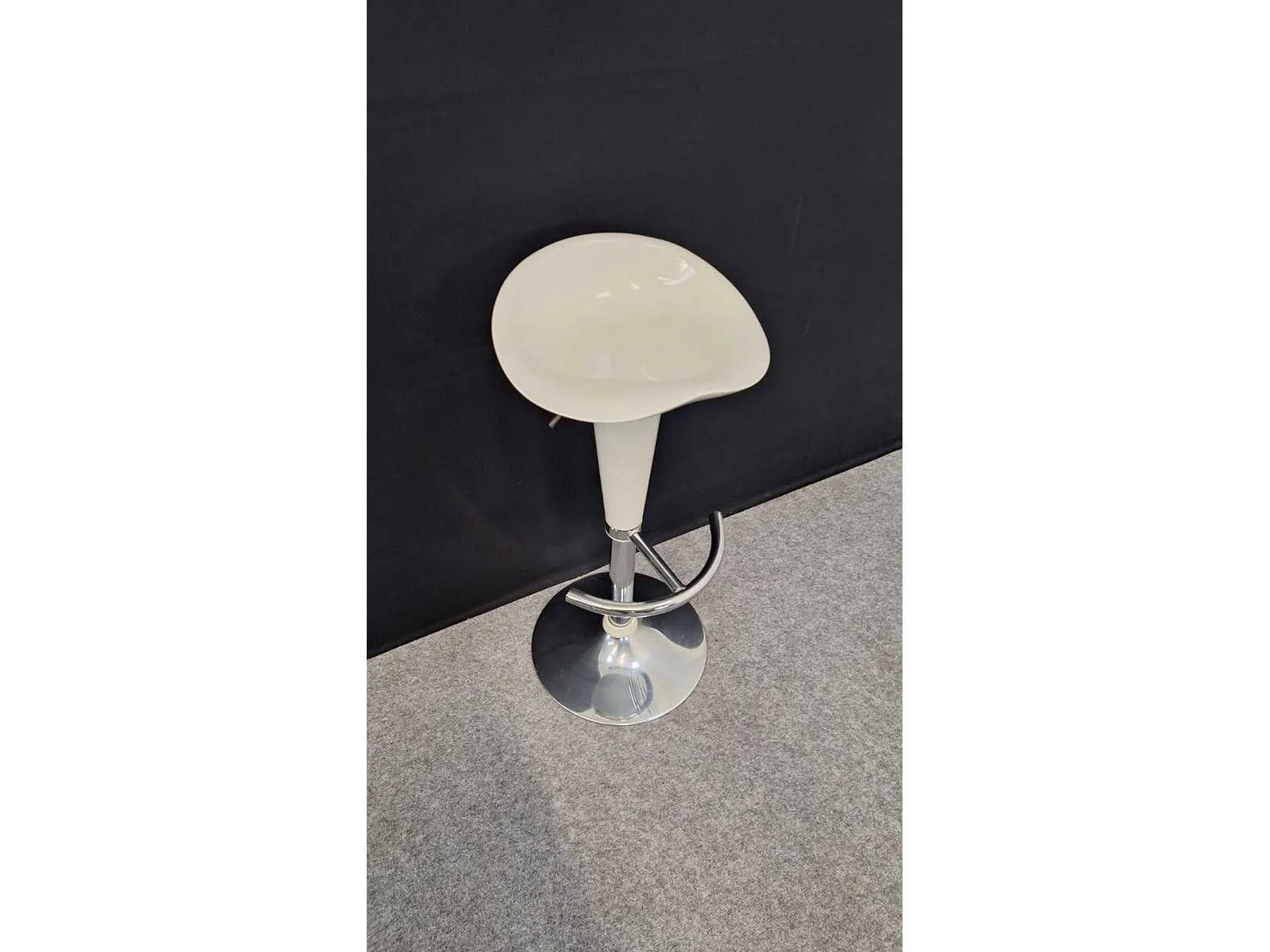 Onderstel in metaal hoogglans verchroomd voorzien van voetsteun, kruk in kunststof kleur Wit, in hoogte verstelbaar tussen 66 en 80 cm, gebruikssporen aanwezig No Merk: NN Kleur: chroom-wit Gewicht: 80kg Diameter ca.: 40 Hoogte: 66-80cm Materiaal: metaal, chroom, kunststof