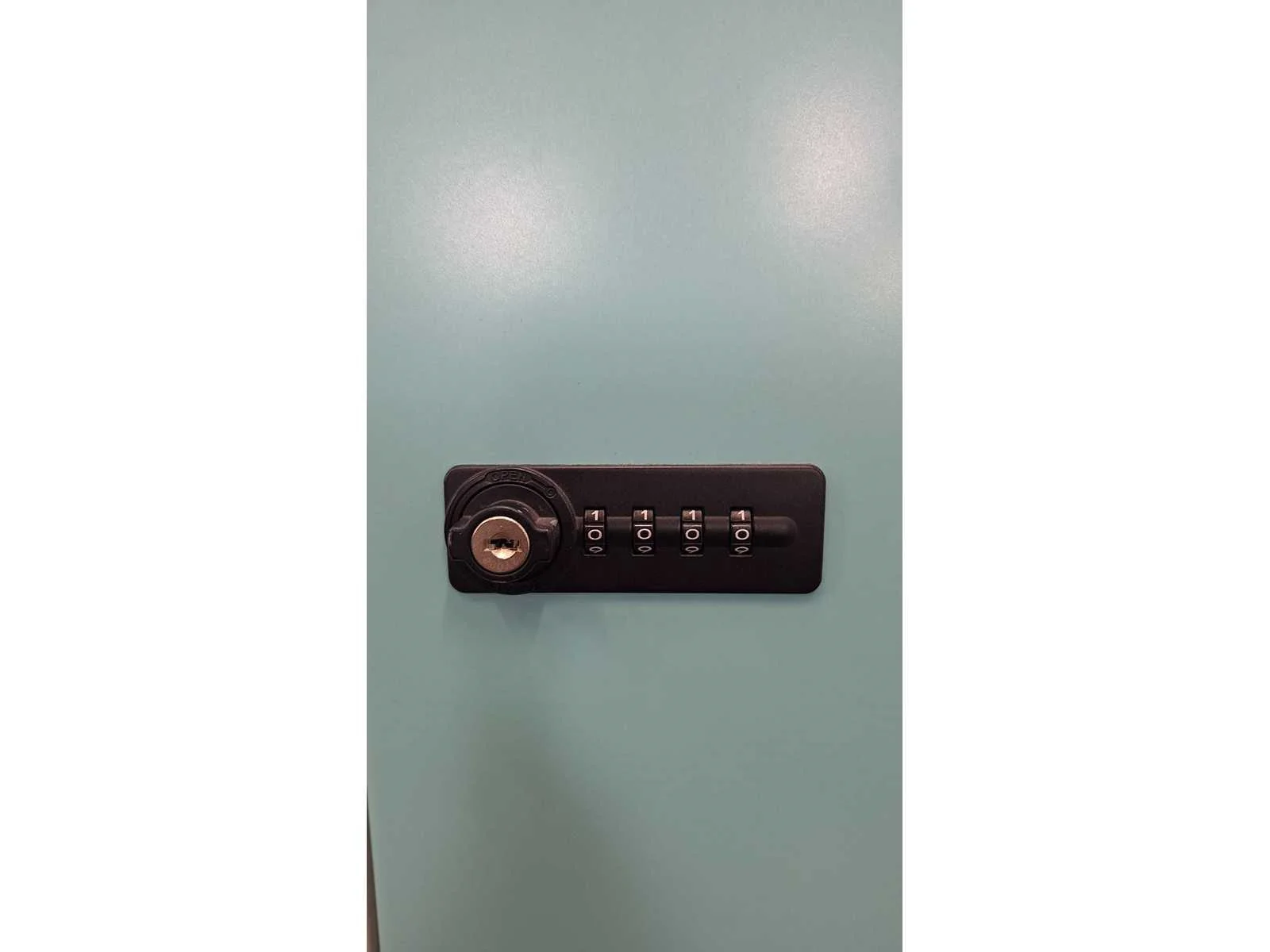Kast volledig in metaal kleur wit, uitgerust met 10 deuren kleuren Wit/Turquise/Roze, elke deur uitgerust met een codeslot voor persoonlijke veiligheid en een persoonlijk nummer, alle sloten zijn ge-reset, gebruiksaanwijzing aanwezig, afm. 1950 x 900 x 500 mm (h x b x d), afmetingen lockers 450 x 350 x 500 mm (b x h x d) , in zeer goede staat, foto's indicatief. No Merk: Robberechts Kleur: Wit-Turquoise-Paars Gewicht: 80kg Lengte: 50cm Breedte: 90cm Hoogte: 195cm Materiaal: Metaal, kunststof Diepte: 50cm