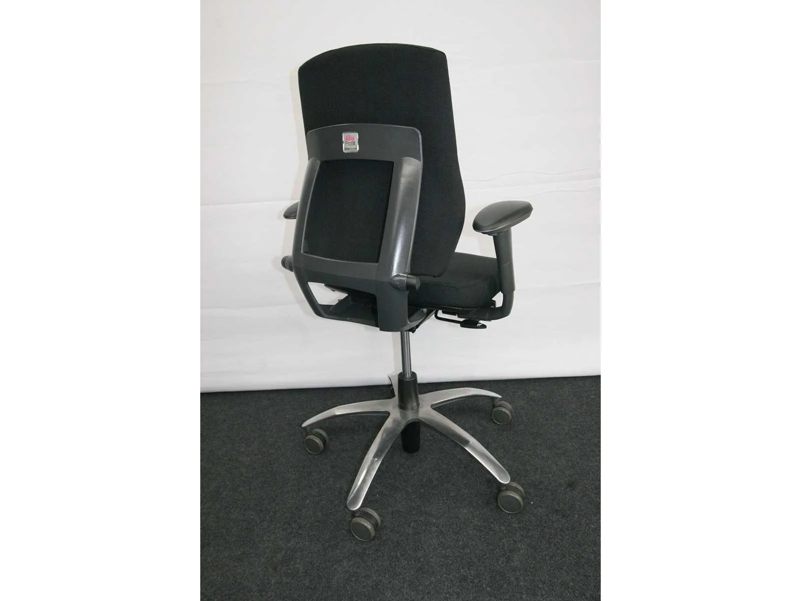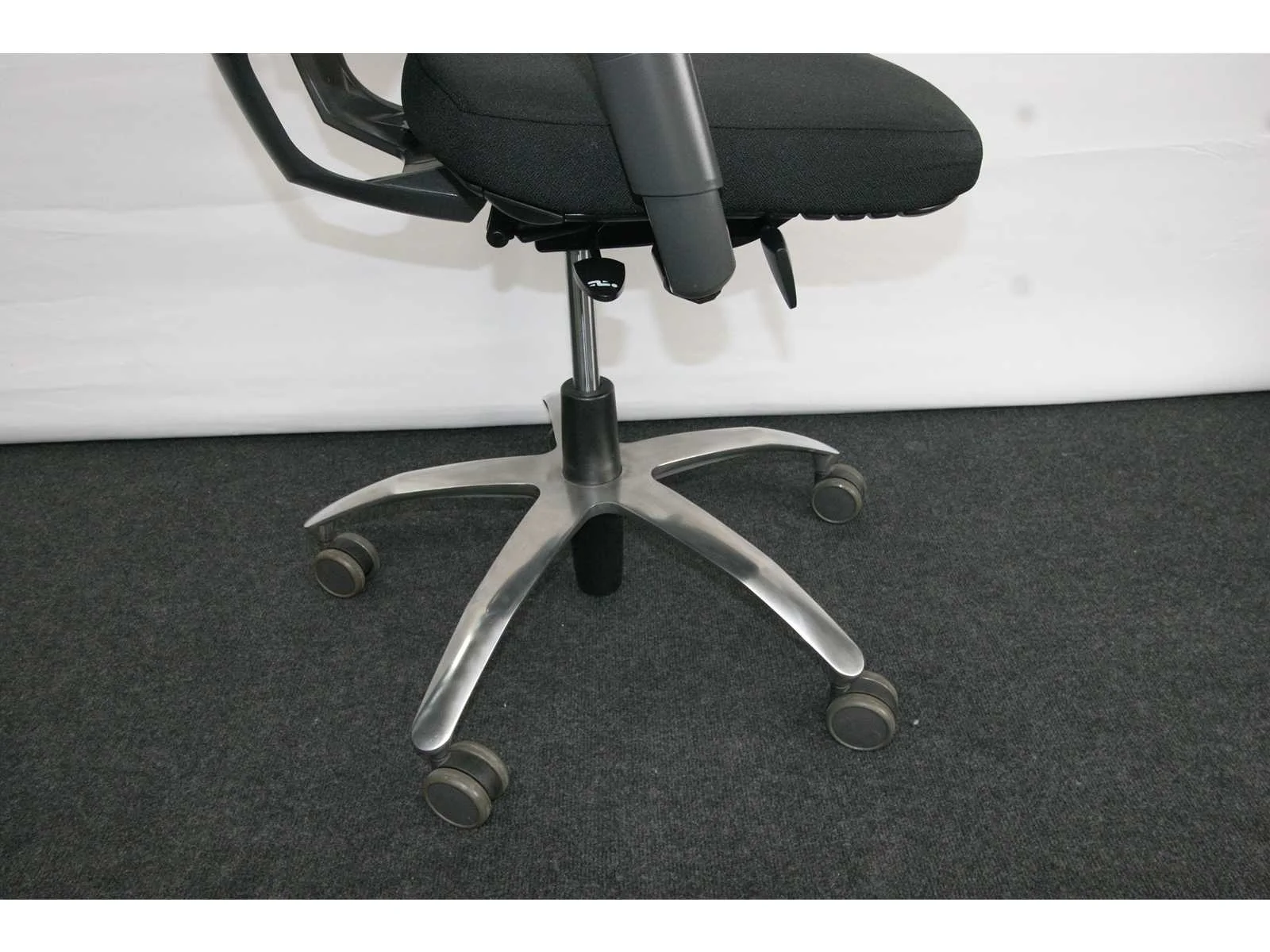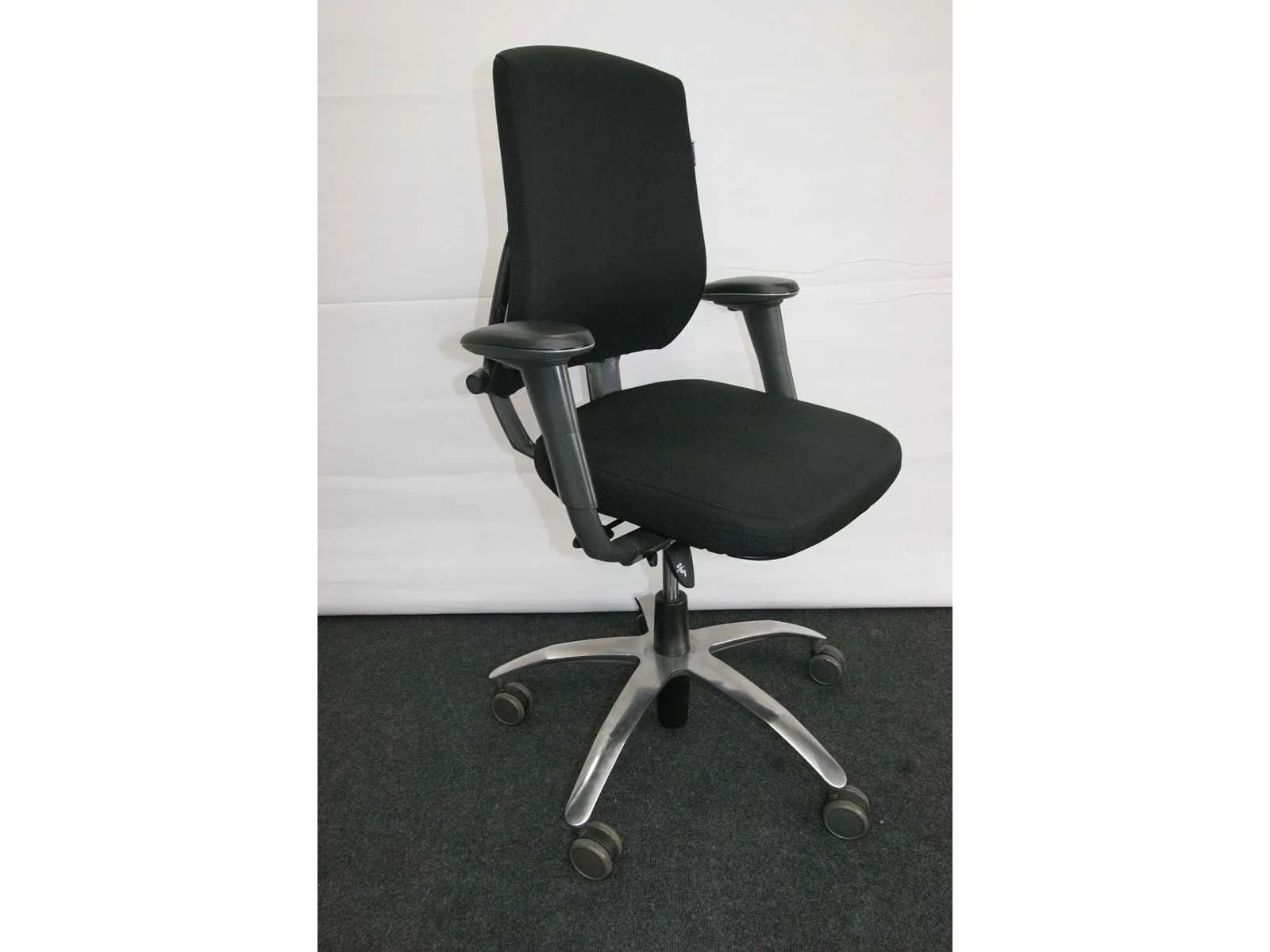 Stervoet in gepolijst aluminium voorzien van PHD zwenkwielen (ook geschikt voor delicate vloeren), bekleding in stof kleur Zwart, in hoogte verstelbaar, synchromechanisme met gewichtsinstelling, verstelbare rugleuning, technisch nazicht en onderhoud gehad, bekleding chemisch gereinigd, lichte gebruikssporen mogelij, foto's indicatief No Merk: BMA Type: AXIA Profit Kleur: Zwart Gewicht: 30kg Breedte: 70cm Hoogte: 100cm Diepte: 70cm Materiaal: Metaal, aluminium, kunststof, stof
