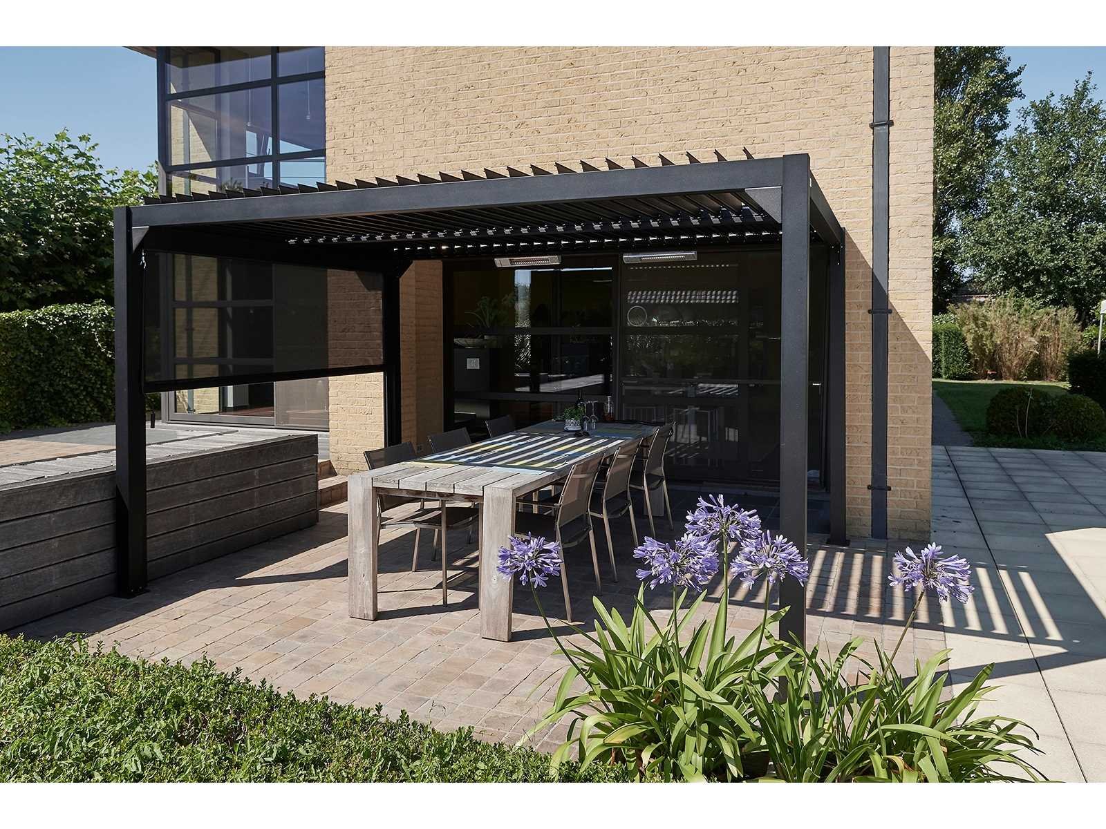 Oogt strak, modern design Wordt ook wel bio-klimatische pergola genoemd (bioclimatics) Met het oriënteerbare lamellendak bepaal je zelf de lichtinval en het zonlicht Twee zones die je apart kan bedienen biedt een grote meerwaarde; leef buiten met het comfort van binnen Geïntegreerde waterafvoerkanalen in lamellen en palen; kwalitatief aluminium Zwarte structuur poederlak (korrel); inox/RVS (roestvrij staal) inbus schroeven Optionele windvaste ZIP screens (jaloezieën) bieden bescherming tegen wind, zon of regen (en insecten) Kan losstaand of aangebouwd gemonteerd worden; eenvoudige montage No Merk: SolidCube Model: 4x4m Product type: Terrasoverkapping Kleur: Antraciet