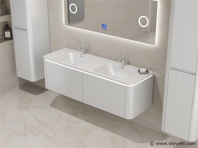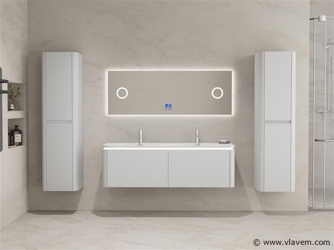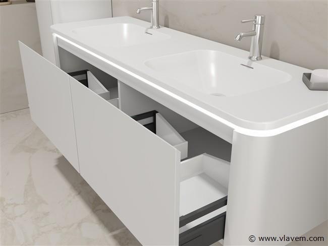 Aantal: 1 Merk: Vonato Type: BOSTON1401-WH Model: Badkamermeubel 2 persoons 140 cm Kranen: Incl. 2 kranen Materiaal: Melamine en MDF Afmetingen Complete set: 1 * Wastafelmeubel - 1400x455x400mm, 1 * Dubbele wasbak - 1405x460x190mm, 2 * Zijkast - 1500x350x350mm, 1 * Spiegel- 1400x600mm Kleur: Wit Voorzien van: LED verlichting in onderkast - 2 kranen inclusief pop-up afvoer – 2 lades - Softclose lade systeem - LED spiegel met anti-fog systeem - Voorgemonteerde zijkasten en wastafelmeubel. Conditie: Nieuw